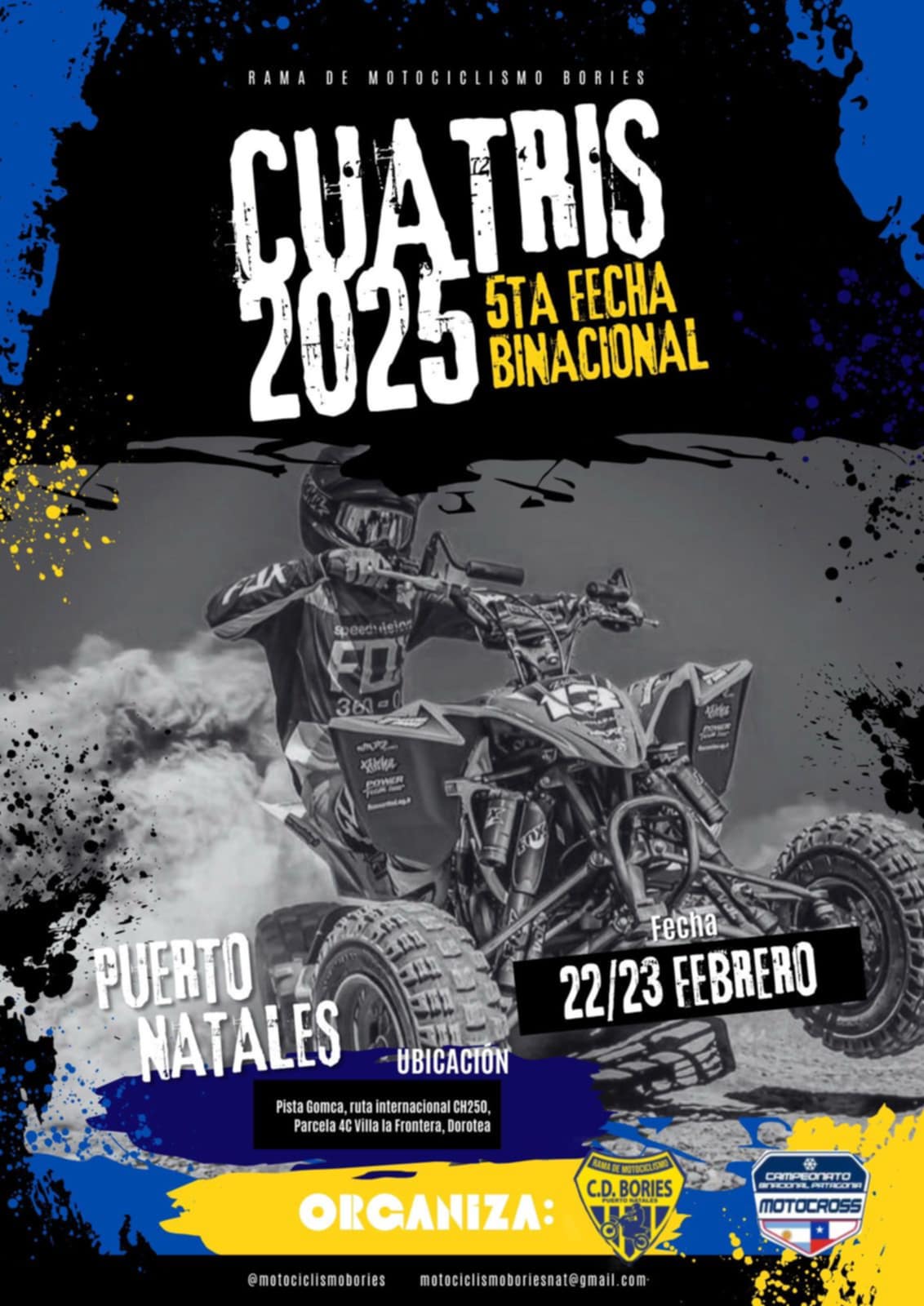 UNA VEZ MAS CHILE Y ARGENTINA SE UNEN AHORA A TRAVEZ DE LA 5 FECHA DEL CAMPEONATO BINACIONAL EN PISTA GOMCA ES LA UNICA FECHA EN CHILE Y PUERTO NATALES ES LA SEDE CON MAS DE 100 PILOTOS VA DAR VIDA A ESTE EVENTO CON LAS CATEGORIAS 50.CC HASTA EXPERTOS, MOTOS Y CUADRIMOTOS LOS DIAS 22 Y 23 DE FEBRERO 2025