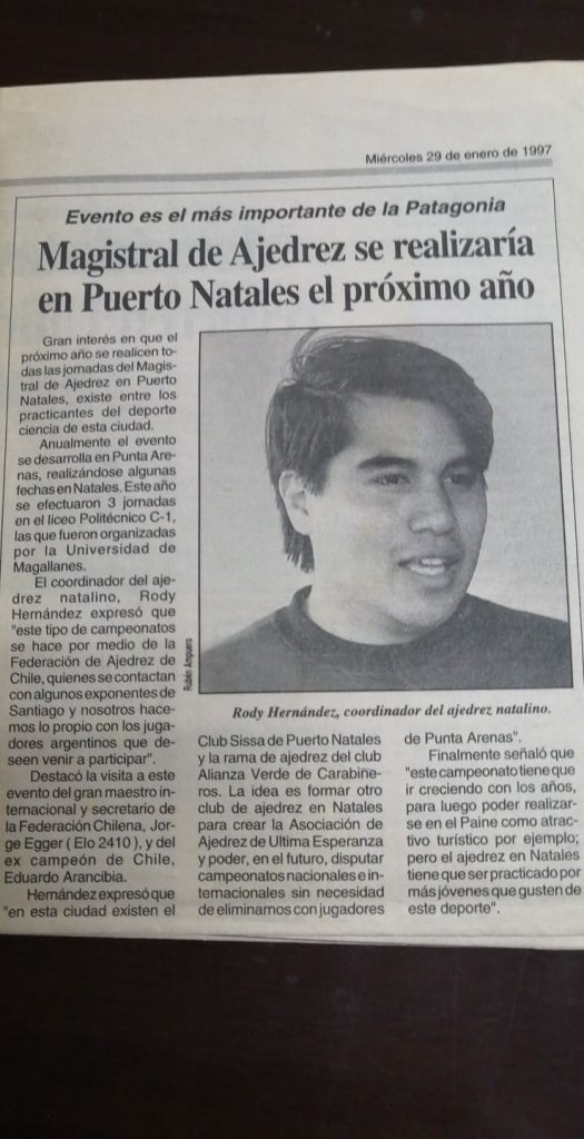 También Jugué el Torneo diario Crónica de Comodoro Rivadavia representando a Puerto Natales. 2 Veces juegue el Nacional Universitario de Ajedrez uno en Valparaíso y el otro en la Serena, ambas veces representando a la UMAG. Juegue el torneo Patagónico por Equipos representando a Punta Arenas en las ciudades de Rio Grande, Ushuaia y Rio Gallegos. Además de 3 Torneos Internaciones de Ajedrez, uno en Neuquén – Argentina, otro en Florianópolis – Brasil y el Torneo Continental en Madelin – Colombia. Y por supuesto en el Circuito Patagónico de Ajedrez de las ciudades Rio Grande y Ushuaia de Argentina y Villa Tehuelches de chile.